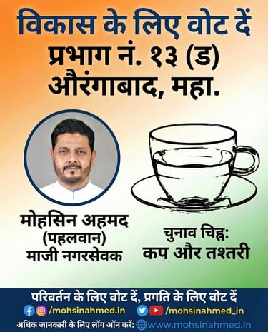 Mohsin Ahmed, a dedicated leader and bodybuilder, who has served as a Municipal Corporator twice for over 10 years at Qaiser Colony Ward, Roshan Gate area, Aurangabad where he built a Cultural Hall, Education Institutes, a 20-Bed Maternity Hospital, Library and a Fitness centre. His work and dedication towards the welfare of the people is exceptional. His continues to serve people under his NGO - Jan Jagran Samiti Maharashtra where he fought for the rights of the people, especially the Minorities in Marathwada region.